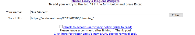 I will also try to maintain a round-up post each week in which I will share a little bit about the previous week’s prompt, though this is the bit with which time and health may interfere, so please ensure you leave your link in the comments!