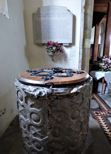 Behind the font is a memorial plaque commemorating the life of author Winifred Holtby, best know for her novel, South Riding, and for her friendship with Vera Brittain, who wrote Testament of Youth, and whose Testament of Friendship tells much of the two women’s lives during and after the First World War. Holtby was born just yards from the church and is now buried in the churchyard at Rudston.